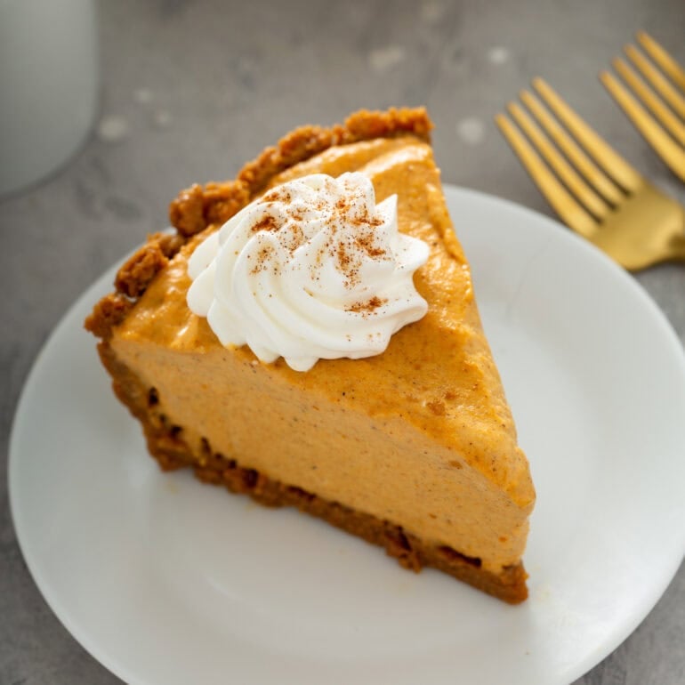 Creamy pumpkin ice cream in a crisp, spiced ginger snap crust — the very best of each worlds!