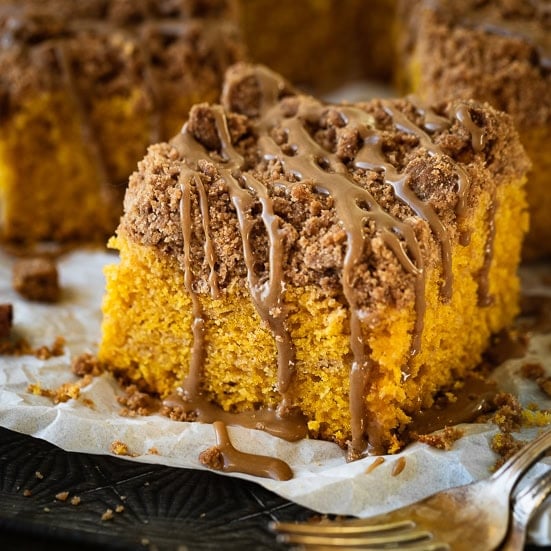 A young pumpkin cake topped with a candy cinnamon crumb that’s good for breakfast, brunch, or dessert.