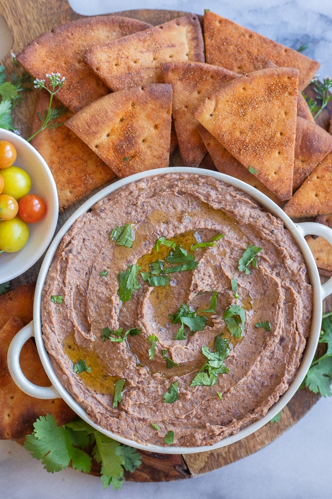 BLACK BEAN HUMMUS WITH SEASONED PITA CHIPS