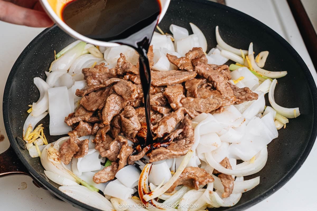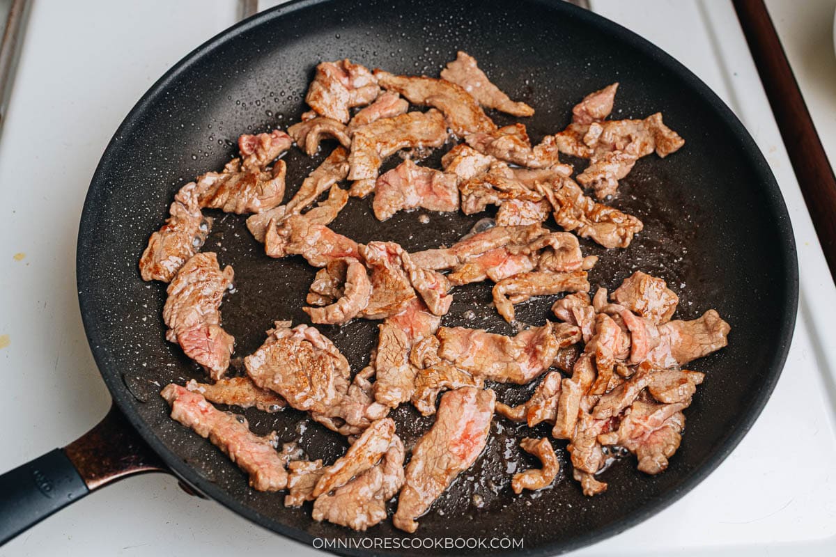 6. Mix beef and sauce: Return the meat to the skillet and pour within the ready sauce. Use tongs or chopsticks to toss all the pieces collectively till nicely blended.