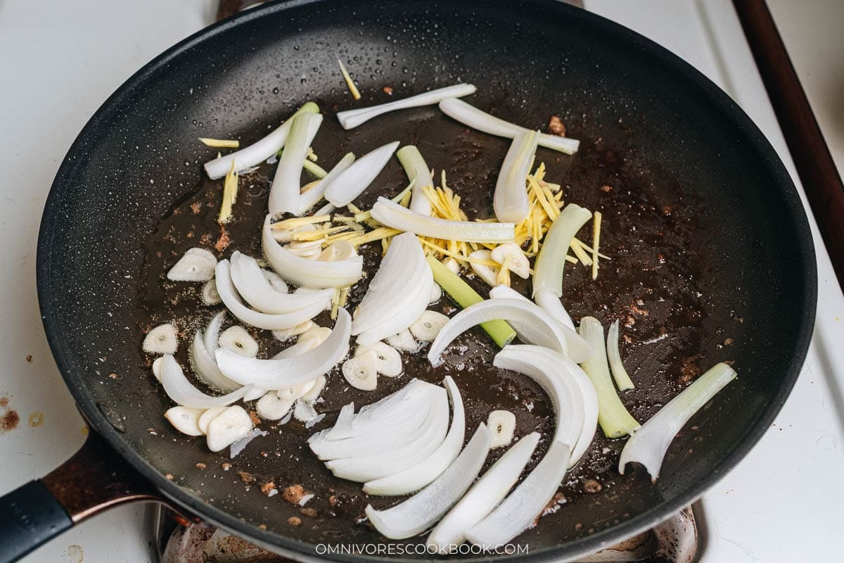 4. Prepare dinner the aromatics: Add the remaining oil to the identical skillet and decrease the warmth to medium. Add the ginger, garlic, white onion, and the white a part of the inexperienced onions, then stir and prepare dinner.