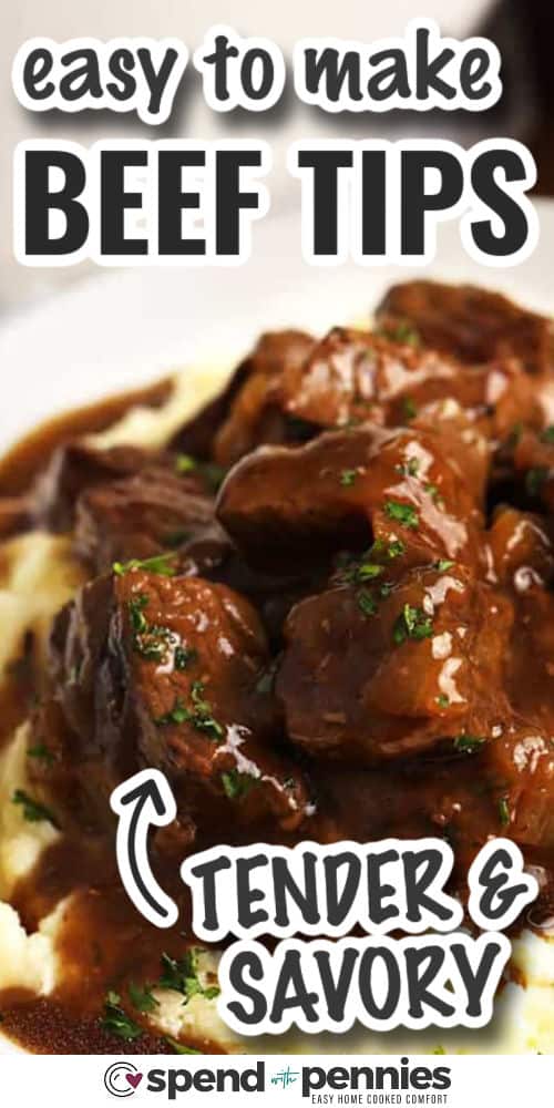 flavorful Beef Tips in the pot and on mashed potatoes with a title