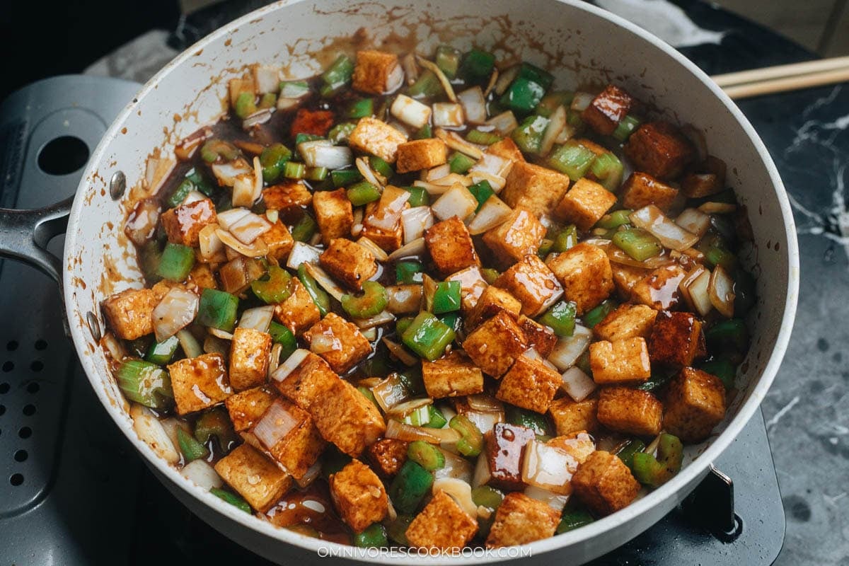 Add the cooked tofu again into the pan and toss to coat evenly.