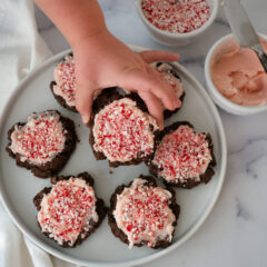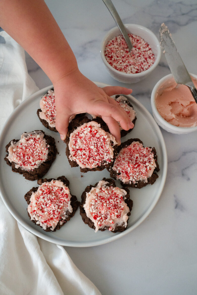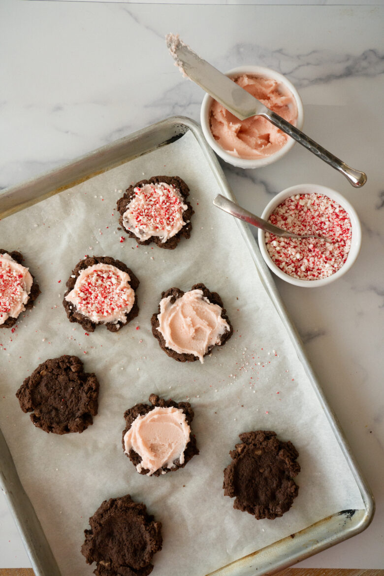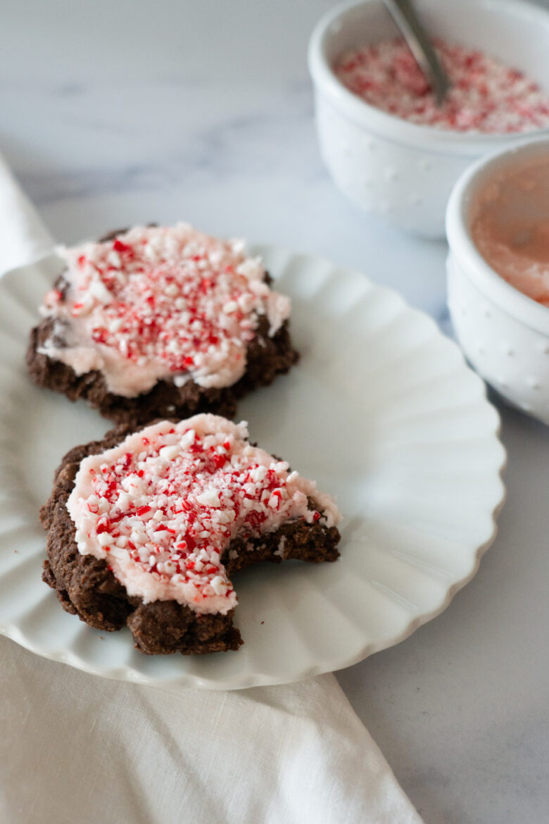 Darkish chocolate cookies coated in pink cream cheese frosting and sprinkled with crunchy peppermint bits. So festive!