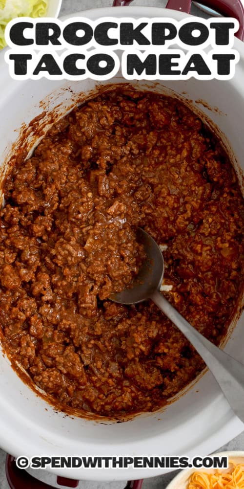 Overhead of a crockpot with saucy Taco meat and a spoon with textOverhead of a crockpot with saucy Taco meat and a spoon with text