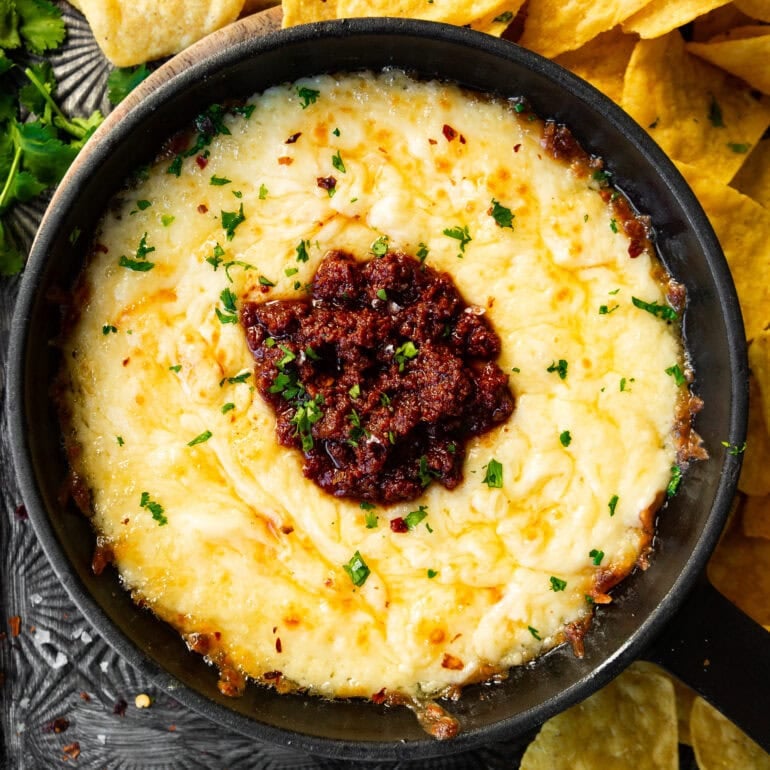 Spicy, tacky, skillet-baked goodness that includes melty cheese and completely seasoned chorizo.