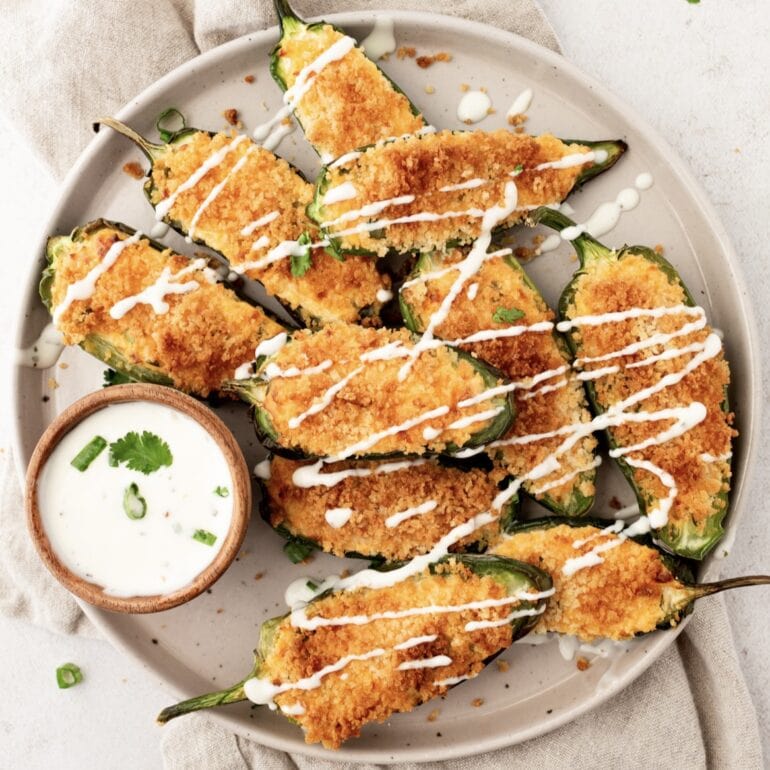 Spicy jalapeños stuffed with creamy cheese and air-fried till completely bubbly.