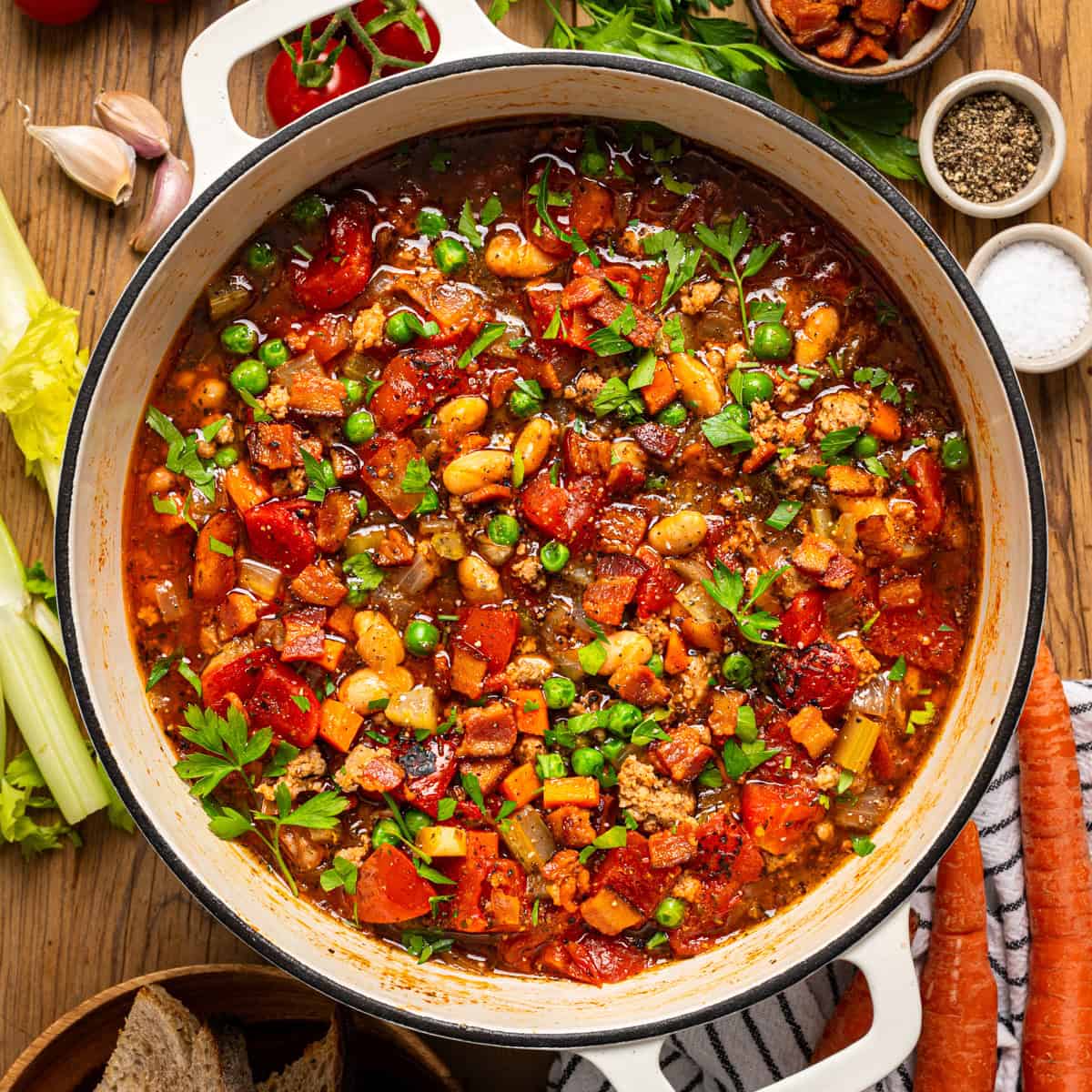 - Vegetarian model? Swap turkey for lentils or further beans, use veggie inventory, and skip bacon or add smoked salt – I’ve examined it, and the flavors maintain up amazingly for meatless Mondays.