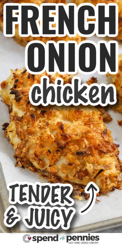 This French onion baked hen is a simple weeknight dinner made with hen breasts coated in Dijon and egg, then pressed into crispy fried onions. It’s baked, not fried, and comes out golden brown with hardly any prep.