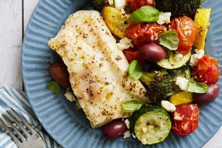 Topped with a drizzle of olive oil, oregano and a beneficiant sprinkling of crumbled feta, cod roasts alongside a vivacious veggie medley—we’re a fan of this mix of broccoli florets, zucchini and yellow squash, however you possibly can substitute any quick-cooking veggies that float your boat.