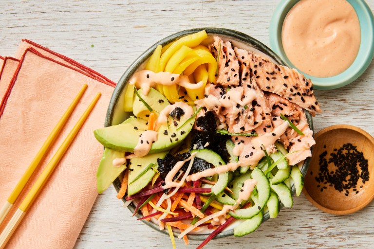 Whereas the salmon and rice are cooking, you possibly can slice up the fruit and veggies and whisk collectively the sriracha-mayo. Then, pile up the elements, drizzle with dressing and luxuriate in! No methods right here—it truly is that straightforward.