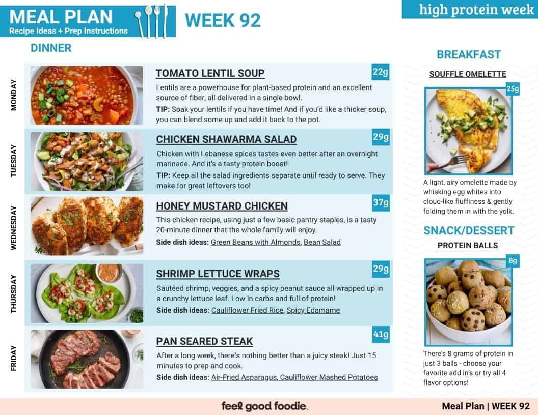 This week’s meal plan consists of 5 dinner recipes for every day of the week: Tomato Lentil Soup, Hen Shawarma Salad, Honey Mustard Hen, Shrimp Lettuce wraps, and Pan seared Steak, together with two bonus recipes to prep for breakfast: Souffle Omelette and a dessert/snack recipe: Protein Balls. Hope you take pleasure in them.