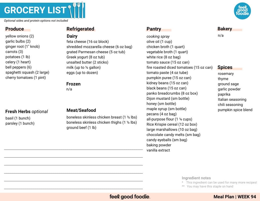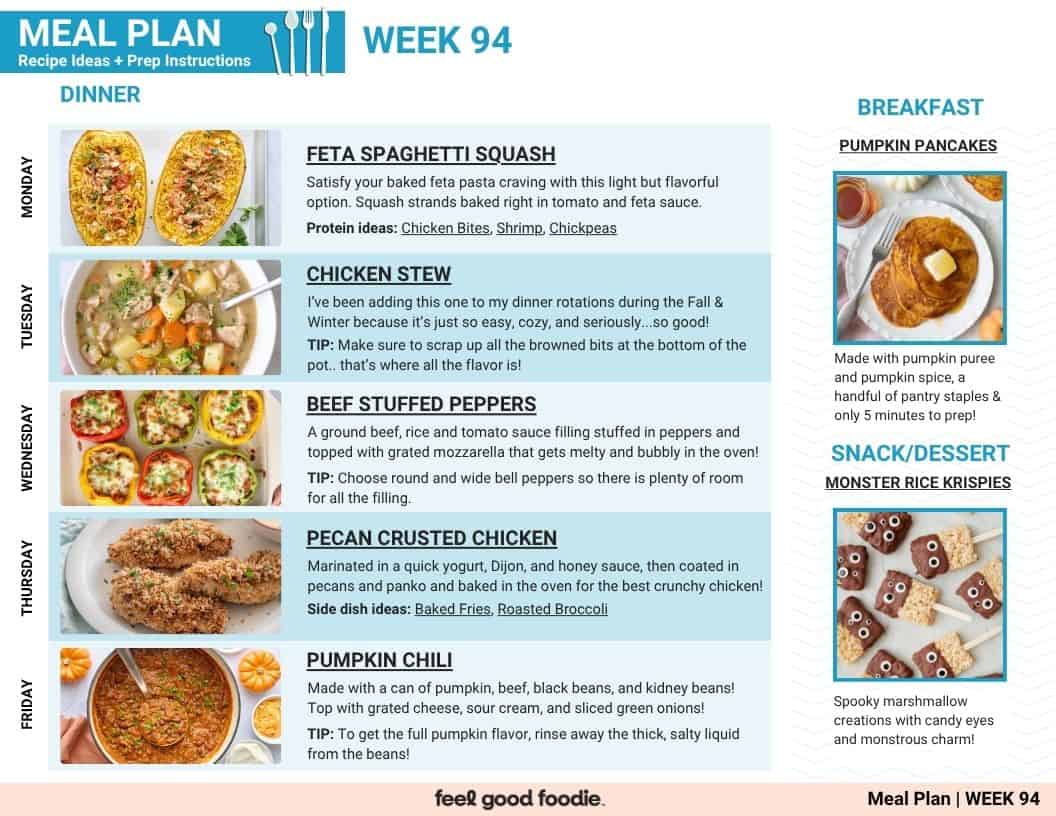 This week’s meal plan consists of 5 dinner recipes for every day of the week: Feta Spaghetti Squash, Hen Stew, Beef Stuffed Peppers, Pecan Crusted rooster, and Pumpkin Chili, together with two bonus recipes to prep for breakfast: Pumpkin Pancakes and a dessert/snack recipe: Monster Rice Krispies. Hope you get pleasure from them.