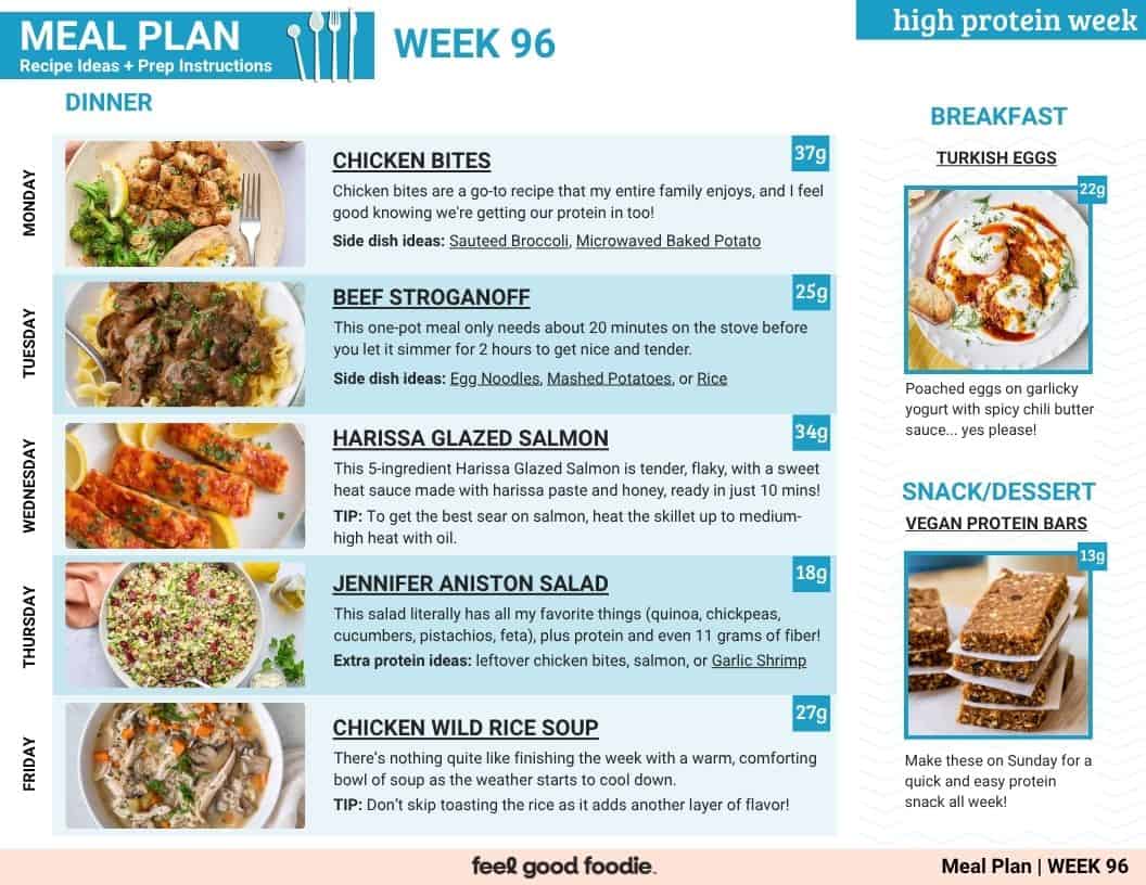 This week’s meal plan consists of 5 dinner recipes for every day of the week: Hen Bites, Beef Stroganoff, Harissa Glazed Salmon, Jennifer Aniston Salad, and Hen Wild Rice Soup, together with two bonus recipes to prep for breakfast: Turkish Eggs and a dessert/snack recipe: Vegan Protein Bars. Hope you take pleasure in them.
