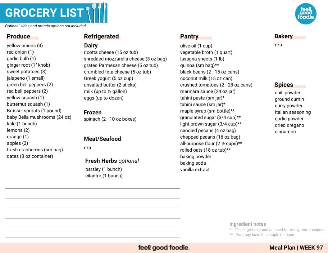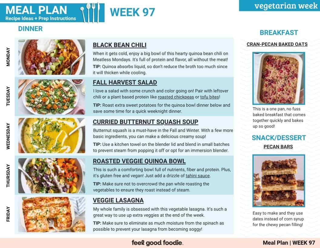 This week’s meal plan consists of 5 dinner recipes for every day of the week: Black Bean Chili, Fall Harvest Salad, Curried Butternut Squash Soup, Roasted Vegetable Quinoa Bowl, and Vegetable Lasagna, together with two bonus recipes to prep for breakfast: Cranberry Pecan Baked Oatmeal and a dessert/snack recipe: Pecan Bars. Hope you take pleasure in them.