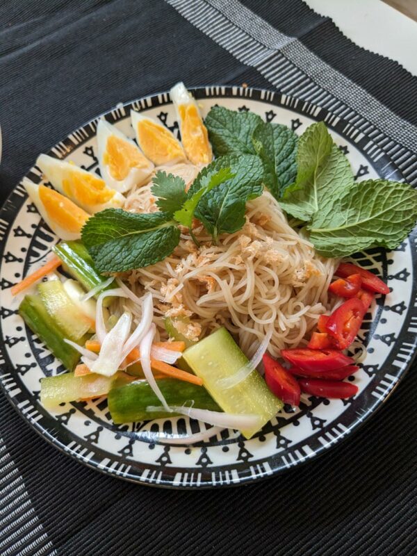 - Place rice noodles within the middle of a serving plate. Place sliced boiled egg and pickles to the aspect of the noodles.