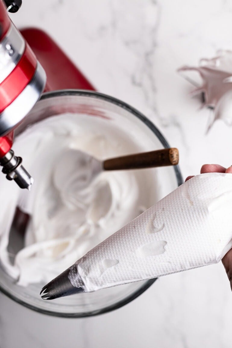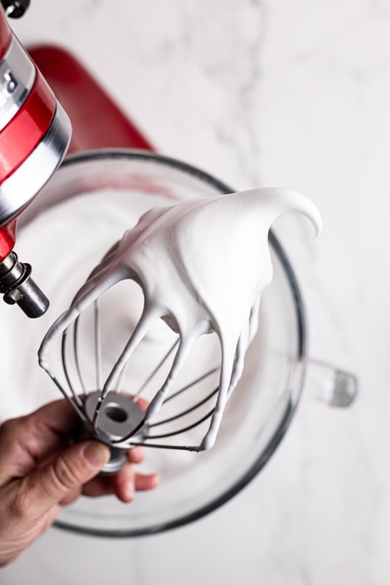 - PRO TIP: Check the meringue by rubbing a small little bit of the combination between your fingers, you shouldn’t really feel the sugar or any grittiness. In case you can nonetheless really feel the sugar, simply whip it slightly longer.