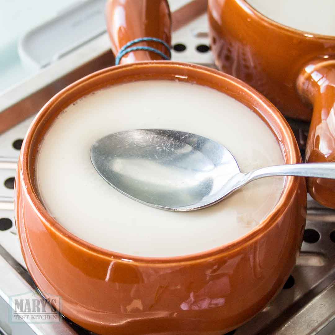 - Hold soy milk simmering (intention for ~175°F / 80°C)