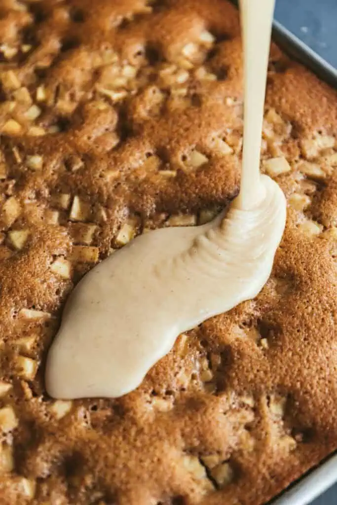 Whereas the cake bakes, soften the butter and apple cider collectively in a medium saucepan over medium warmth. Whisk within the powdered sugar, bitter cream, and cinnamon till easy and pourable.