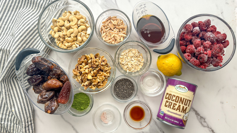 To make this recipe, decide up some Medjool dates and lemon within the produce space, together with some recent or frozen raspberries. Within the dry items space, seize uncooked cashews, walnuts, slivered almonds, rolled oats, a can of coconut cream, matcha, and chia seeds. “Uncooked cashews are necessary right here as a result of we can be mixing them into cashew cream, which will not work properly with roasted and salted cashews,” Hahn explains. Then, examine your pantry for coconut oil, maple syrup, vanilla, and salt.