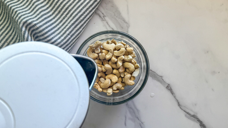 - Add the cashews to a small bowl and canopy with boiling water. Let sit for quarter-hour, then drain.