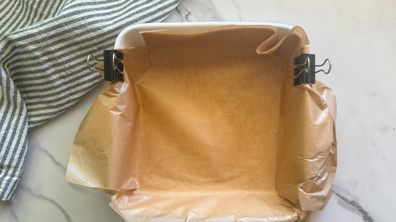- Put together a 9×9-inch baking dish by lining it with parchment paper.