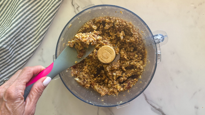 - Add the dates, ½ cup drained cashews, walnuts, almonds, oats, and a couple of teaspoons coconut oil to a meals processor. Pulse till properly blended.