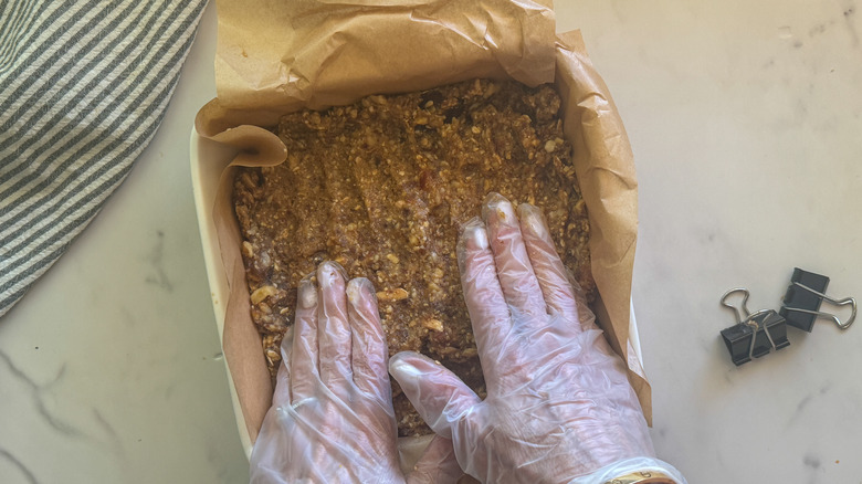 - Press the date combination into the ready baking dish and place within the fridge for half-hour to set.
