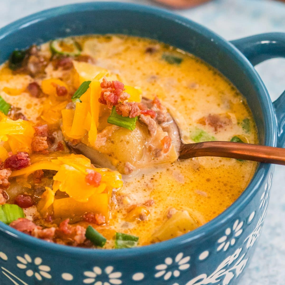 On the spot Pot Cheeseburger Soup is filled with tender potatoes, seasoned floor beef, melty cheddar, and a wealthy broth! Probably the most cozy bowl of soup!