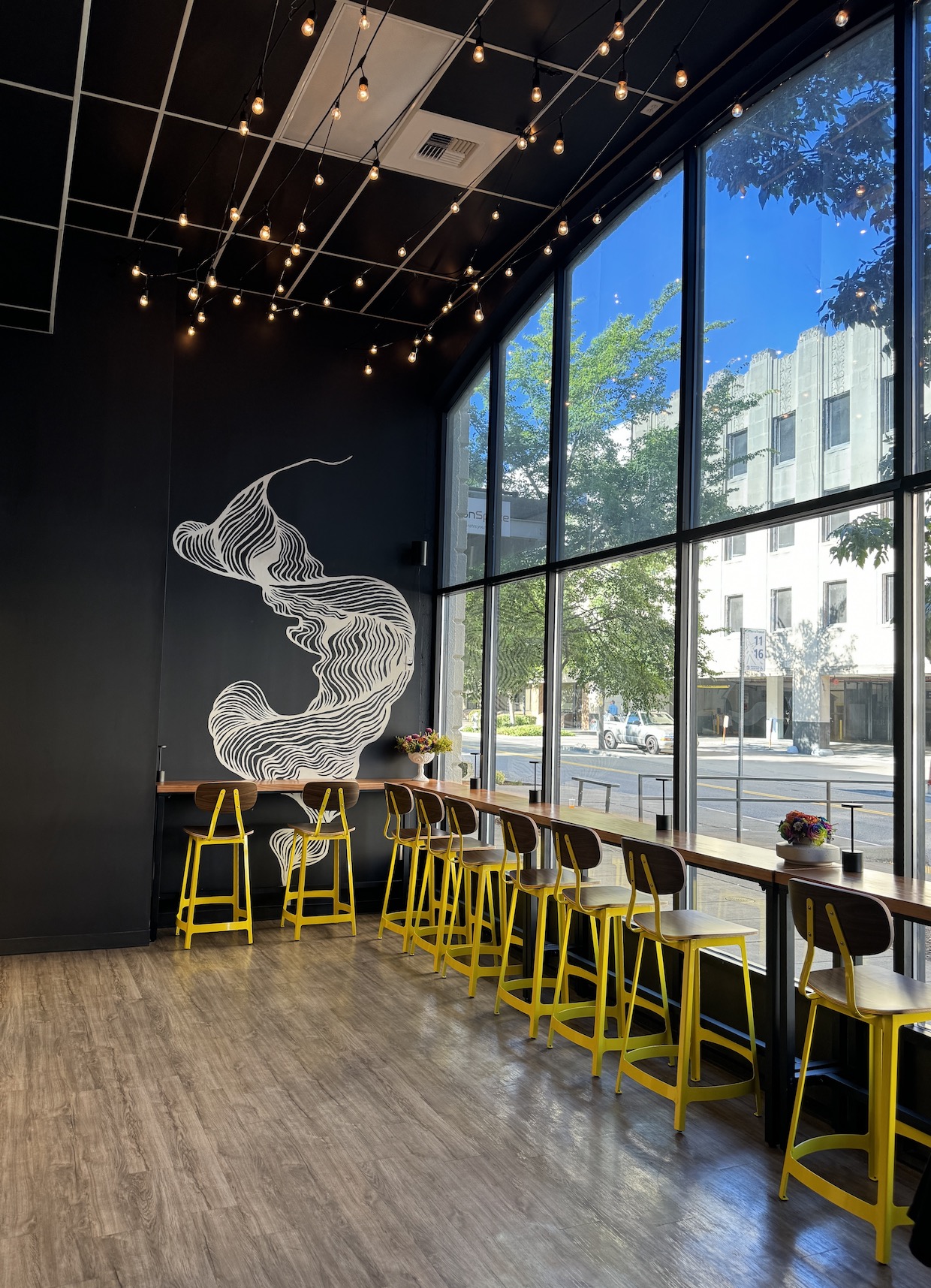 The 600-square-foot espresso store with huge home windows and excessive ceilings brings to life the aesthetic of the roasting firm’s retail packaging, with pops of canary yellow and squiggly line murals painted by Murphy popping in opposition to the black partitions.