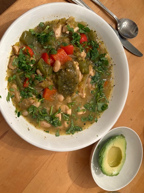 White hen chili with my selfmade roasted Hatch Chili Poblano pepper salsa . Milled the wheat and corn 100% residence milled grains, buttermilk mmmm.