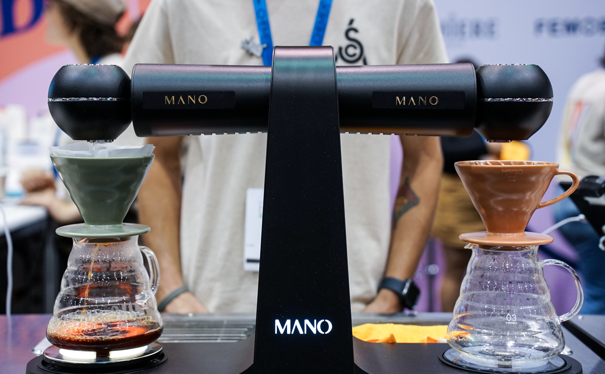 The Mano3 Professional-H2 automated pourover brewer by Mano on the 2024 SCA Expo in Chicago. Every day Espresso Information picture by Howard Bryman.