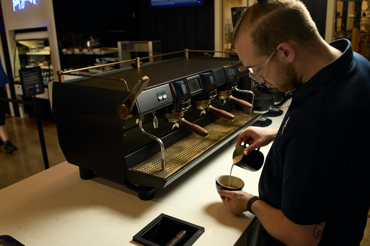 The store features a Poursteady automated pourover machine, a Floor Management Cyclops batch brewer, a Brood nitro dispenser and a Rancilio Specialty espresso machine.