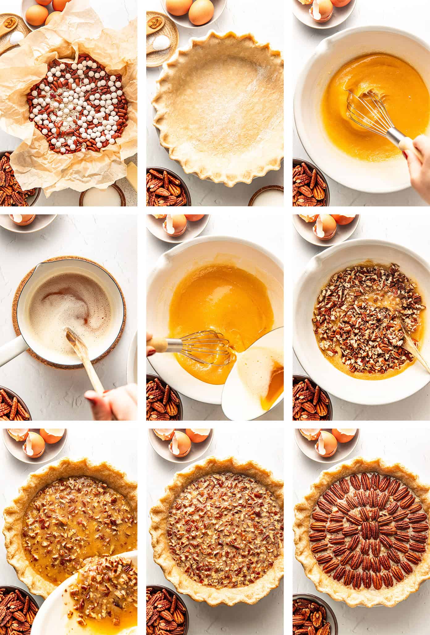3. Put together the filling. In a medium bowl, whisk collectively the sugar, corn syrup, vanilla, salt, and cinnamon. Add the eggs and whisk till easy. Soften the butter in a small saucepan over medium warmth for 4–5 minutes, stirring typically, till it begins to brown, scent nutty, and switch golden. Slowly drizzle the recent brown butter into the sugar combination whereas whisking always to forestall the eggs from cooking. Chop 2 cups of the pecans and stir them into the filling.