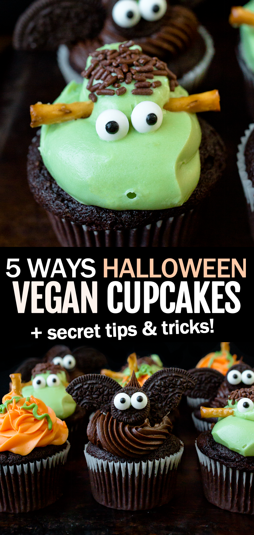 Bats: Swirl chocolate frosting onto a vegan cupcake, then add a mini OREO cookie for the pinnacle and an everyday dimension cookie reduce in half for the wings. Create eyes with an icing author or use edible eye candies.