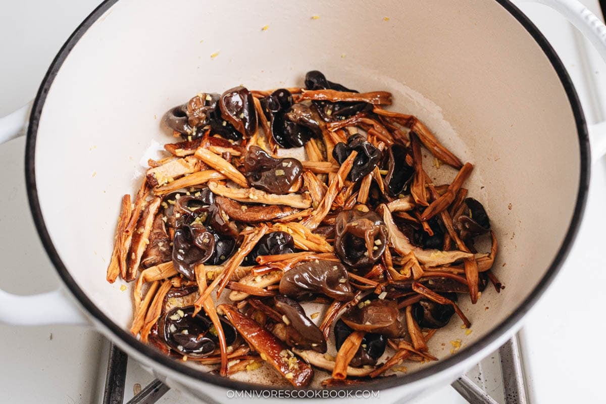 1. Prepare dinner the dried mushrooms: Warmth oil in a big pot over medium warmth. Add the lily flowers and shiitake mushrooms. Prepare dinner and stir till frivolously browned, 1 to 2 minutes. Add the wooden ear mushrooms and minced ginger. Prepare dinner for an additional minute.