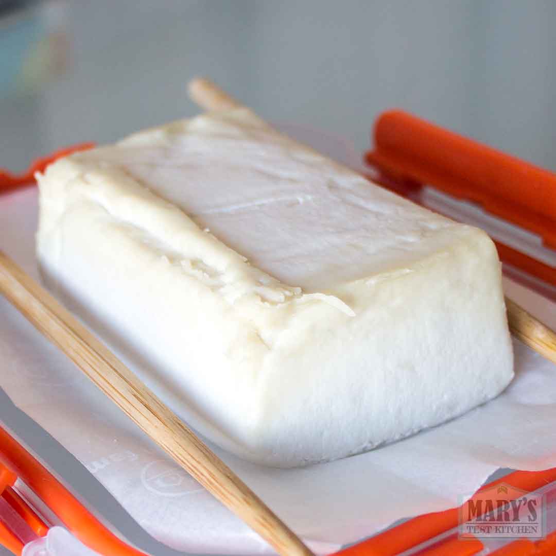 Naturally the following step was to press the thick curds right into a block. I sterilized my instruments and cheesecloth in boiling water and allow them to dry. The tofu press was not sterilized this manner as a result of it’s plastic. As a substitute I simply tried to scrub it very properly with cleaning soap and scorching water and let it dry earlier than utilizing.